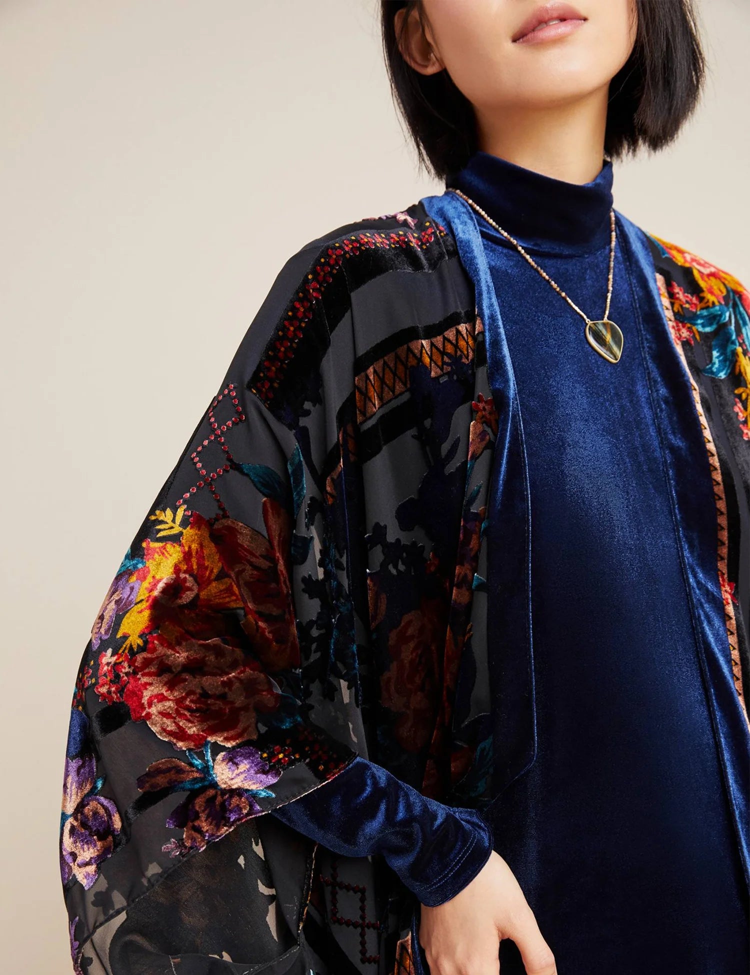 A timeless velvet kimono cardigan that transitions seamlessly from day to night.
