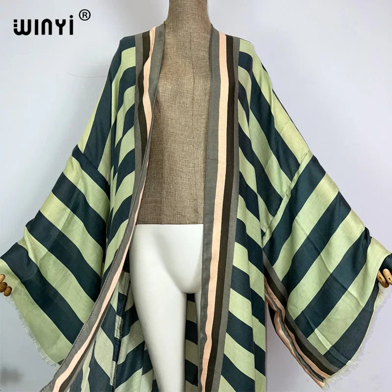 Step into summer elegance with this boho stripe print kimono cardigan, perfect for layering over swimwear or styling as a chic evening outfit. Its lightweight, flowing design makes it ideal for beach holidays, poolside lounging, or casual summer evenings.
