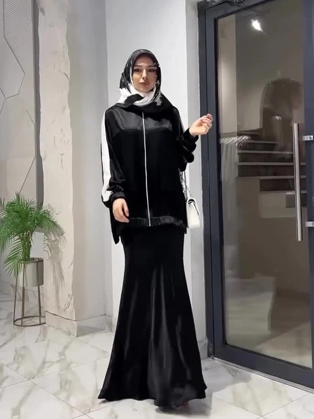 Celebrate modest fashion with this stylish jacket and long skirt set. Featuring a zipper and patchwork design, it’s perfect for Ramadan, cultural events, or everyday elegant wear.